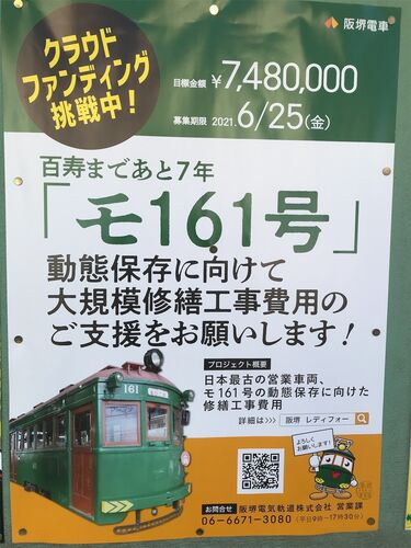 こんばんは。 奈良北西部、雨の夜になっています。 昨日は商用で、生まれた町、 大阪府堺市に出かけました。 阪堺電車 船尾駅で、 見つけてしまいました。(笑) ” 百寿まであと7年 「モ161号」 クラウドファンディング ” 今日現在、5,780.000 …